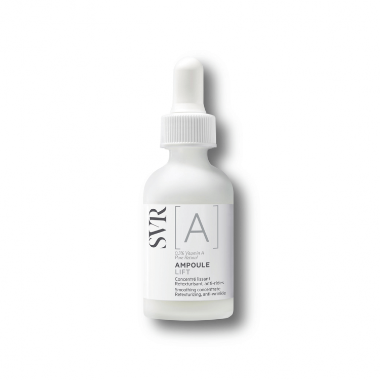 A mais elevada concentração de vitamina A para retexturizar a pele em apenas 7 dias. A vitamina A/Retinol é um dos principais ingredientes ativos que melhoram a textura da pele e corrigem as rugas profundas. 0,3% é suficiente para renovar a pele. A SVR selecionou duas formas de vitamina A, incluindo uma forma encapsulada que associa a máxima eficácia e tolerabilidade para a pele sensível. Esta associação suaviza a superfície da pele e regenera a epiderme. Retinol puro concentrado a 0.1% Retinol puro encapsulado a 0.2% por lipossomas na membrana fosfolípidica – similar aos das células da pele – é libertado continuamente no interior da epiderme. A sua formula galénica leitosa funde-se no imediato com a pele e difunde os ingredientes com resultados visiveis e a pele torna-se mais suave e confortável.