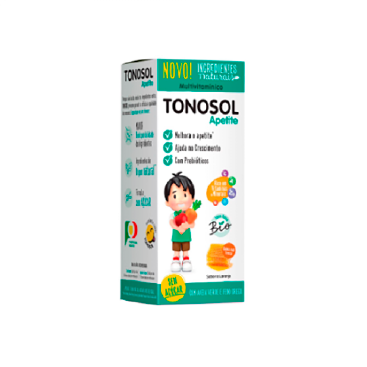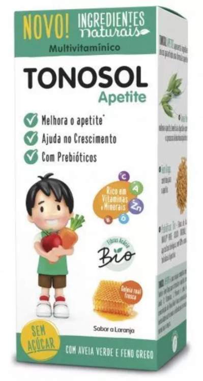 Tonosol Apetite é um multivitamínico rico em vitaminas e minerais, com ingredientes que estimulam o apetite e prebióticos. Tonosol Apetite é formulado com ingredientes únicos que ajudam no crescimento e a melhorar o apetite. A Aveia Verde melhora o apetite, a digestão e ajuda nos processos naturais de desintoxicação do corpo, enquanto que, o Feno Grego contribui para o apetite, a Geleia Real atua como revitalizante e a melhorar o apetite e os Prebióticos Bio contribuem para o bem-estar geral e digestivo. POSOLOGIA: 3 a 6 anos - 5ml, 1 vez por dia; Mais de 6 anos, adolescentes e adultos - 10 ml, 1 vez por dia. Agitar antes de usar.