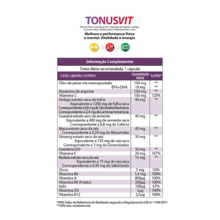 Suplemento alimentar energizante que contribui para a redução do cansaço e da fadiga, normal funcionamento muscular e do metabolismo produtor de energia. Fórmula à base de Óleo de Peixe, Coenzima Q10, Aspartato de Arginina, Ginkgo, Guaraná, Maca; rodiola, Zinco, Iodo e Vitaminas. Não recomendado a grávidas, nem a crianças. Contém cafeína. Tomar 1 cápsula ao pequeno-almoço.