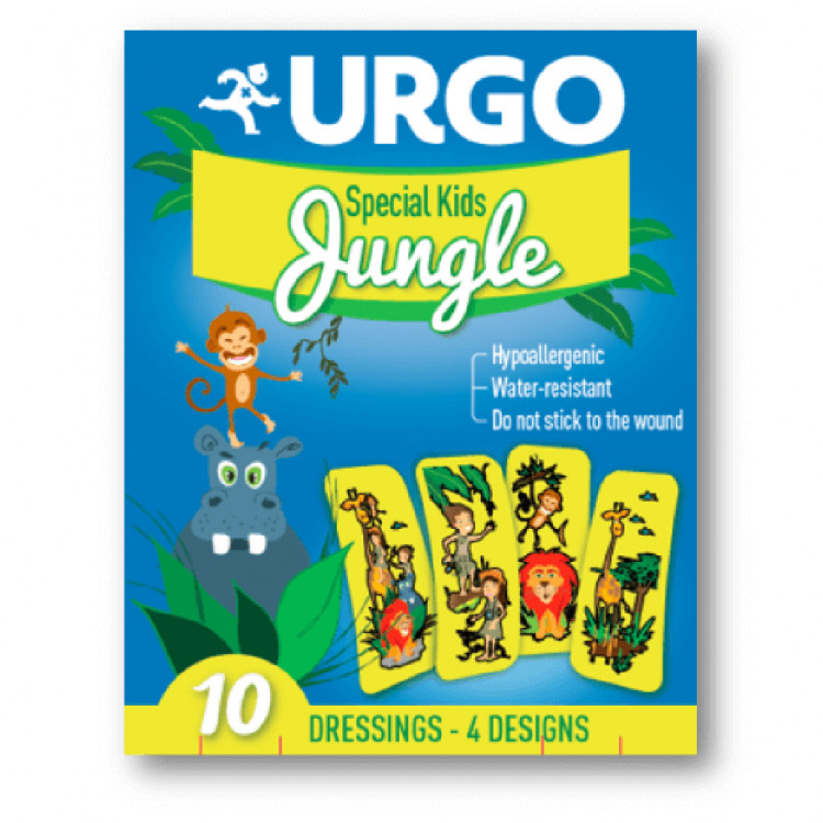 Urgo Jungle são pensos resistentes à água e hipoalergénicos para proteção e absorção de exsudados de feridas superficiais. Compressa neutra e remoção indolor. Suporte com motivos "Selva" com 4 designs diferentes. Para todas as idades.