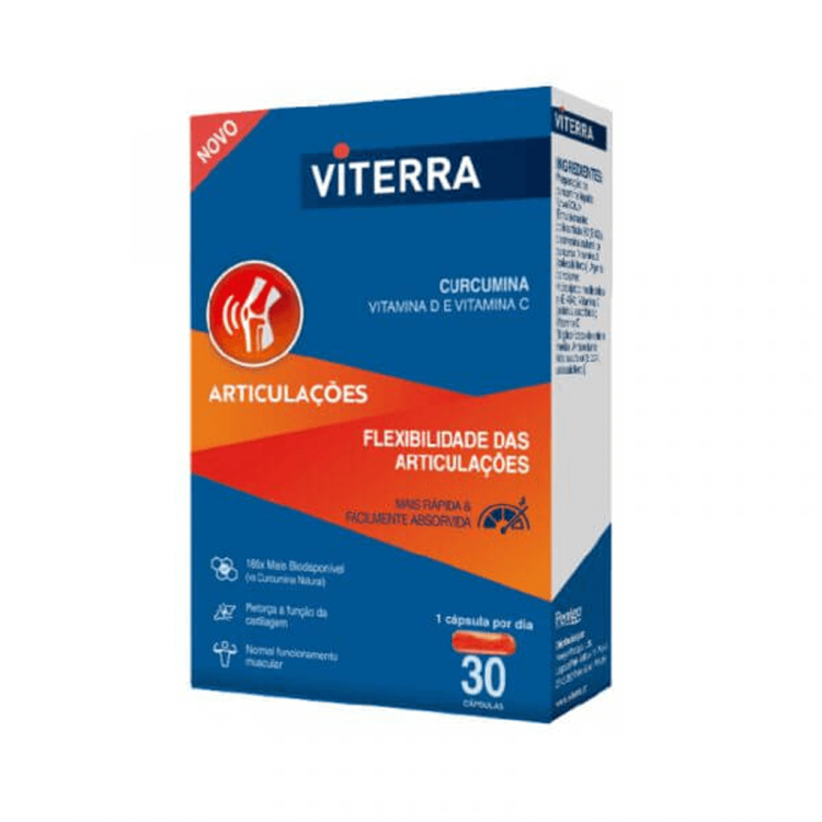 Viterra Articulações é um suplemento alimentar para a manutenção da saúde das suas articulações. Contribui para o normal formação do colagénio para o funcionamento normal das cartilagens, manutenção de ossos normais e para o normal funcionamento muscular. Contém Curcumina, Vitamina D e C. Com a tecnologia patenteada Novasol, a curcumina é absorvida mais rapidamente e permanece mais tempo no organismo. Sem açúcar, sem corantes, sem conservantes, sem glúten, sem gelatina, sem lactose. Adequado a vegetarianos.