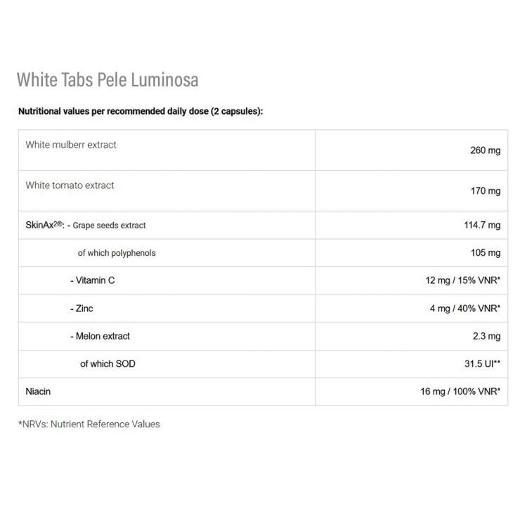 Suplemento alimentar que melhora a tez da pele e reduz as manchas e vermelhidão. Fórmula exclusiva com SkinAx2® (Extrato de Graínhas de Uva, Vitamina C, Zinco, Extrato de Melão), Tomate Branco e Amora Branca, rica em polifenóis. Ajuda ainda a revitalizar a pele e melhorar a sua saúde e aspeto geral. Recomenda-se a toma de 2 cápsulas por dia durante um mínimo de 3 meses.
